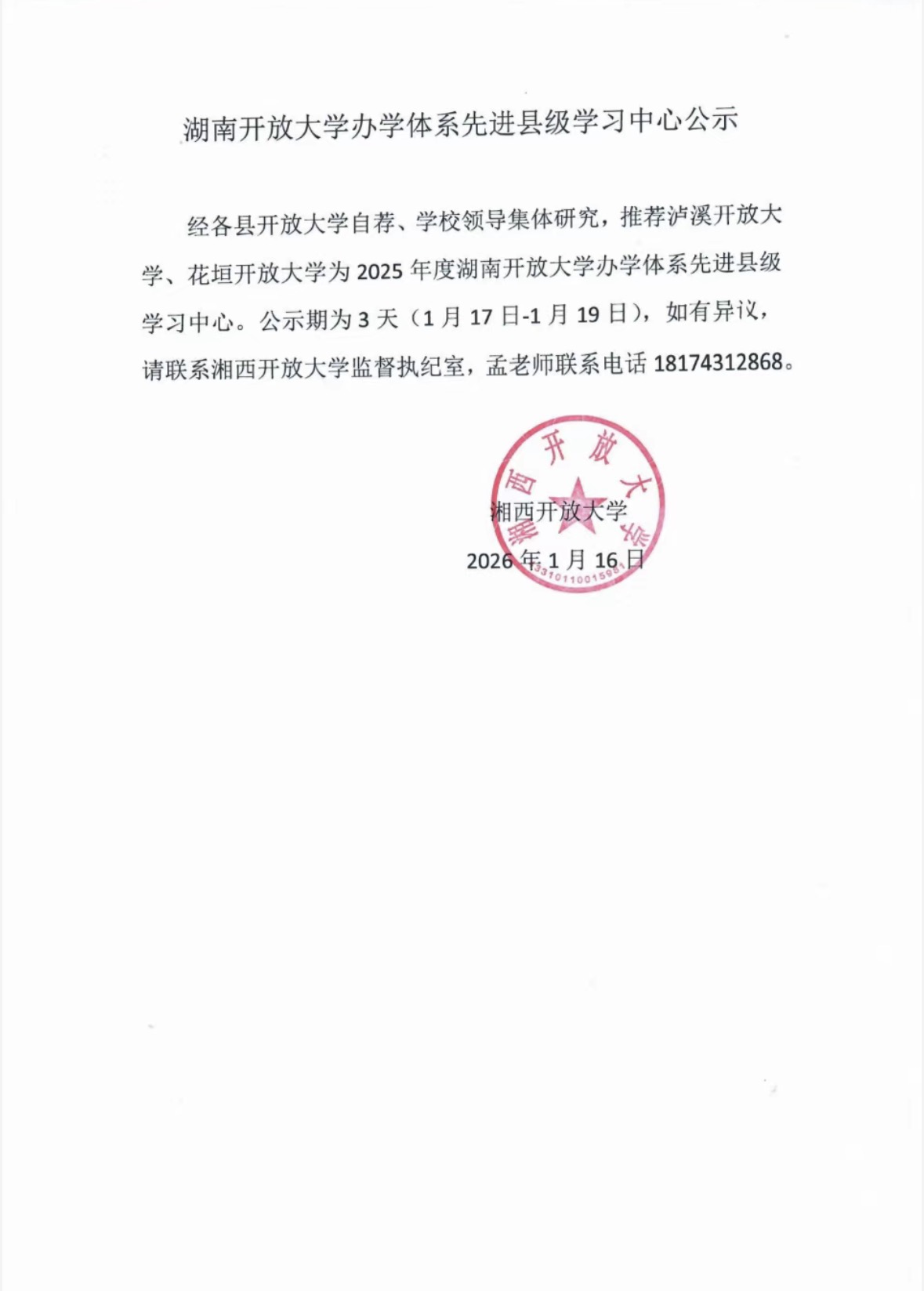 湖南开放大学办学体系先进县级学习中心公示