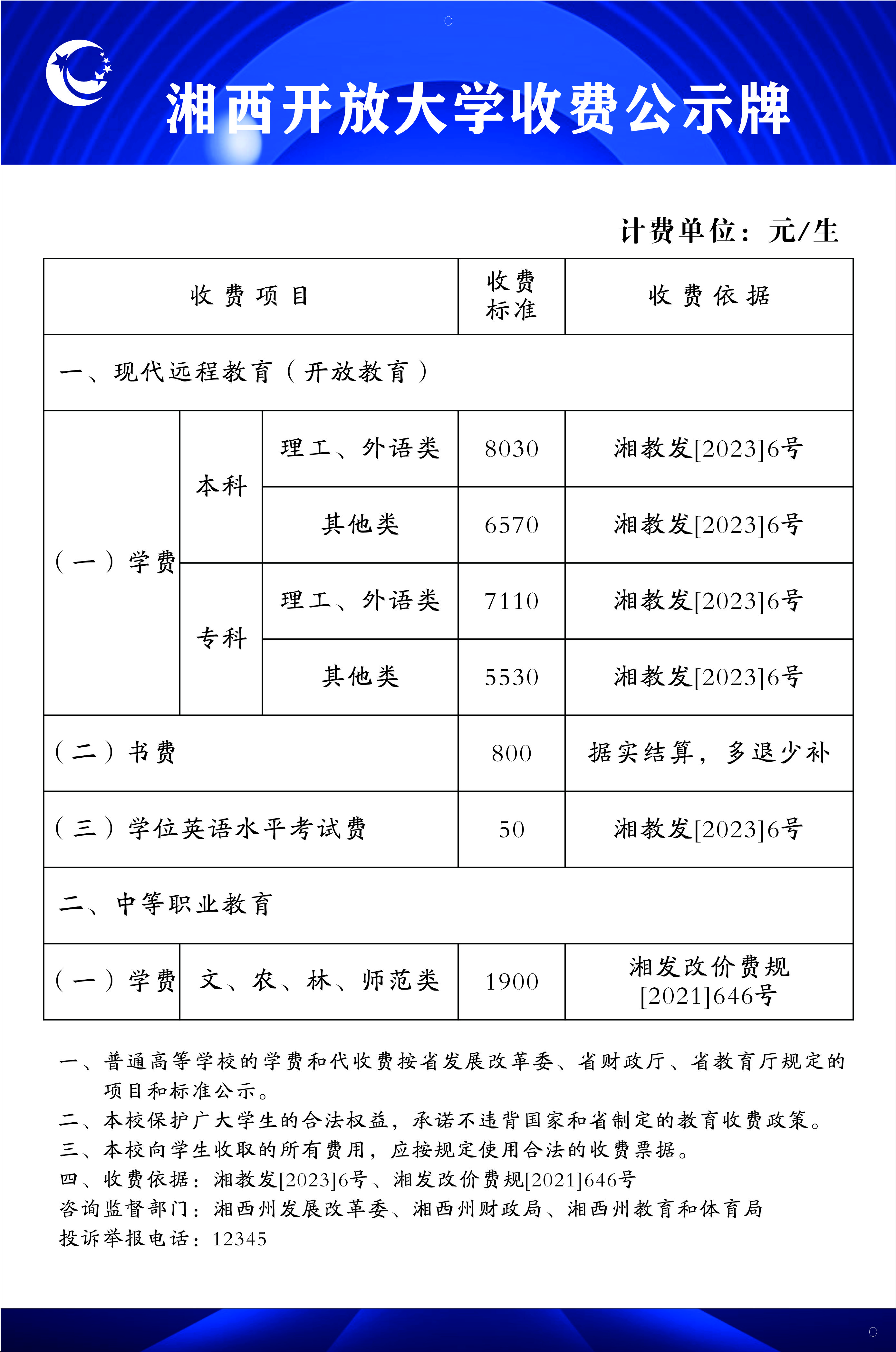 湘西开放大学收费项目公示